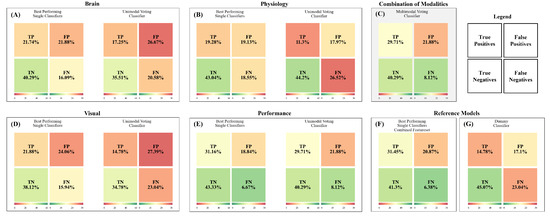 Prediction of the subjectively perceived mental effort (confusion matrix of test set) based on a median split; validation set: . Percentage of correctly and falsely classified perceived mental effort per model across all test subjects: TP = True Positives, TN = True Negatives, FP = False Positives, and FN = False Negatives, with “Positives” representing “High Mental Effort” and “Negatives” representing “Low Mental Effort”. For the “Best Performing Single Classifier” we selected the classifier (LDA, LR, SVM, KNN, RFC, or GNB) with the best F1 score for each subject. Confusion matrices based on (A) fNIRS data, (B) physiological data (heart rate, respiration, and body temperature), (C) a combined, weighted feature set, (D) visual data, (E) performance data (accuracy and response time), (F) a combined, but unweighted feature set, and (G) a dummy classifier representing an empirical chance level.
