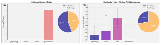 Weights and procedure of a multimodal voting classifier to predict subjectively perceived mental effort based on a median split; validation set: . (A) shows the allocation of weights when all modalities are included in the multimodal classification. (B) shows the allocation of weights when performance measures are not included in the multimodal classification. Error bars represent the standard deviation.