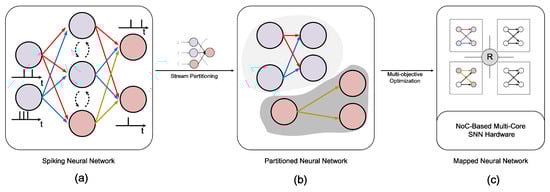 Recently, neuromorphic hardware designs, such as TrueNorth [7], Loihi [8], and SpiNNaker [9], have recently emerged. These designs feature multiple interconnected neuromorphic cores (NCs) through a network-on-a-chip (NoC), enabling the energy-efficient and high-performance execution of SNNs [10]. To bridge the gap between SNNs and hardware implementation, various mapping schemes have been proposed [11,12,13]. These schemes typically involve two stages: partitioning and mapping. During the partitioning stage, the computation graph of SNN neurons is divided into clusters under the constraints of the neuromorphic hardware. The mapping stage then places these clusters onto physical neuron cores to achieve different optimization objectives.