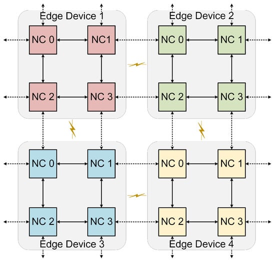 To provide a clearer understanding of the edge computing modes, we devise a simplified hardware model as depicted in Figure 5. For the sake of clarity, we assume that each edge device consists of four neuromorphic cores interconnected through a 2D mesh. Although actual devices may have more cores, our model seeks to effectively clarify the system’s fundamental architecture. Additionally, to emulate collaborative edge computing, we model four edge devices as interconnected via a mesh topology. The dashed lines in the figure represent the communication pathways between devices within a cooperative edge computing environment, with the fog layer being the primary facilitator for such interactions. For the purposes of our study, we make the following assumptions: