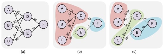 Exhibition of partition strategies and corresponding cost analysis: (a) original SNN graph displaying the number of spikes, (b) partition result producing 3 clusters consisting of 4 neurons, 1 neuron, and 1 neuron, respectively; (c) alternative partition result resulting in 3 clusters, each containing 2 neurons.