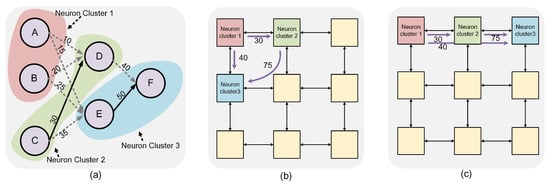 Demonstration of neuron cluster mapping strategies for NCs: (a) partitioned neuron clusters, (b) mapping scheme with low congestion, and (c) mapping scheme with high congestion.