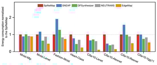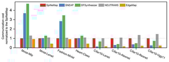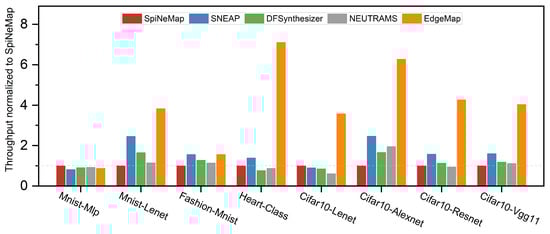 Figure 10 offers a comparative analysis of the normalized throughput for each application across the mapping schemes under evaluation, with each scheme normalized to SpiNeMap. This comparison is pivotal for understanding the operational efficiency of each scheme within the edge computing context. The analysis reveals that EdgeMap surpasses all other mapping schemes in terms of throughput performance. Notably, EdgeMap’s throughput is 4.02× greater than that of SpiNeMap, and outperforms SNEAP, DFSynthesizer, and NEUTRAMS by 2.52×, 3.43×, and 3.65×, respectively.