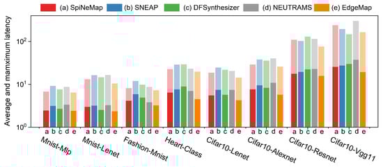 Figure 12 illustrates the comparative analysis of both average and maximum spike latencies across applications for the evaluated mapping schemes. Consistent color patterns are used to denote individual mapping schemes, with darker shades representing average latency, and lighter shades indicating maximum latency. Our evaluation reveals that EdgeMap consistently outperforms other schemes, demonstrating lower average and maximum latencies. Specifically, EdgeMap’s average latency is 19.8% lower than that of SpiNeMap, while its maximum latency is reduced by 22.5%. Comparatively, EdgeMap’s average latency reduces by 33.4%, 29.2%, and 35.5% against SNEAP, DFSynthesizer, and NEUTRAMS, respectively. Similarly, its maximum latency is lower by 28.6%, 22.9%, and 33.7%.