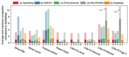 Specifically, EdgeMap outperforms other mapping schemes across all applications. Specifically, the average congestion of EdgeMap is 39.5% lower than that of SpiNeMap, while its maximum congestion is reduced by 40.8%. Furthermore, compared to SNEAP, DFSynthesizer, and NEUTRAMS, EdgeMap’s average congestion decreases by 47.8%, 42.6%, and 81.2% respectively, with maximum congestion reduced by 47.5%, 43.7%, and 74%. Interestingly, NEUTRAMS exhibits inferior performance, which can be attributed to its methodology. This scheme optimizes the communication cost only during the partitioning stage, mapping neuron clusters onto devices sequentially. As a result, it suffers from high congestion.