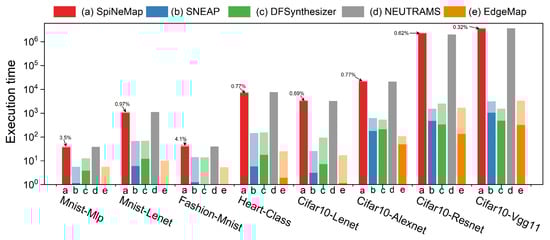 Interestingly, the execution times of SpiNeMap and NEUTRAMS are relatively similar, which can be attributed to their identical partitioning algorithms and objectives. However, NEUTRAMS does not incorporate a separate mapping stage. The partition time dominates the execution time, accounting for 96.5% of the total in SpiNeMap and rising to 99.68% for the CIFAR10-VGG11 application as the complexity of SNNs increases.