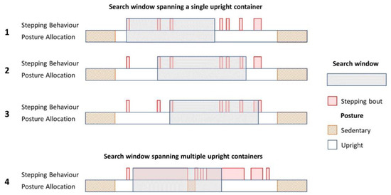 Examples of calculating total step count using a sliding window approach. The lower bar shows the posture of the individual, and the upper bar gives distribution of stepping activity within the upright container. Bar width is used to denote the duration of each stepping bout. The period of activity considered within the current search window is represented by the semi-transparent box.