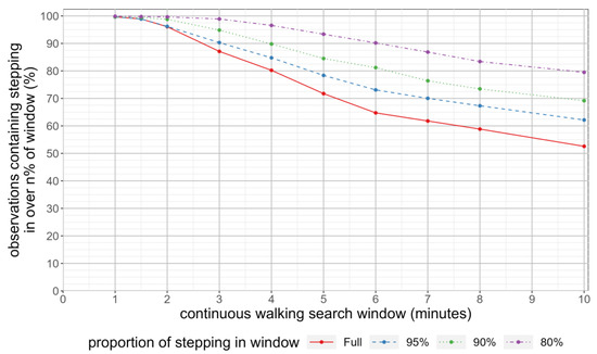 In order to incorporate a tolerance for periods of upright activity that contained multiple, but interrupted, stepping bouts, for each individual we also calculated the duration of stepping within the period they completed their maximum n-minute step count. For each search window duration, we then calculated the proportion of individuals whose stepping time was longer than a given proportion of the window duration (100%, 95%, 90% and 80%, respectively).