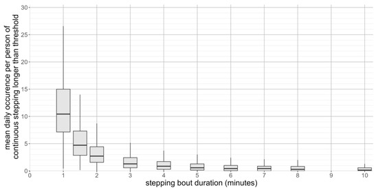 Mean daily occurrence of continuous stepping bouts of different duration during observation period (seven-day observation period).