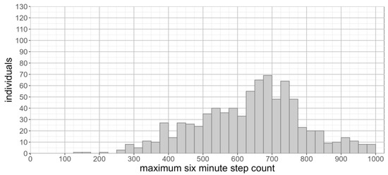 Given the established six-minute walk test and the related two-minute walk test durations, we looked in more detail at the availability of walking bouts for these duration in the free-living data. The maximum six-minute step count was normally distributed (skew = −0.2, kurtosis = −0.2, Figure 4). The maximum six-minute step count was 637 + 142 (range: 142–992). There was no significant difference in the maximum six-minute step count between males (641 + 156) and females (633 + 151) (p = 0.47). No significant difference in the maximum six-minute step count was observed across different months of the year (F(11,802) = 1.44, p = 0.15).
