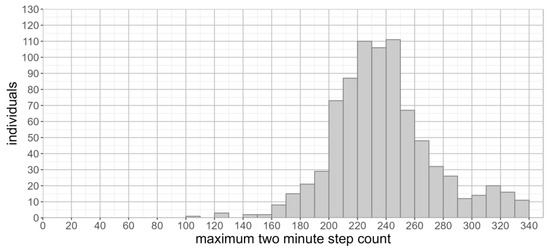 The maximum two-minute step count was normally distributed (skew = 0.4, kurtosis = 0.7, Figure 5). The maximum two-minute step count was 239 + 35 (range, 106–340). There was no significant difference in the maximum two-minute step count between males (238 + 38) and females (240 + 33) (p = 0.37). No significant difference in the maximum two-minute step count was observed across different months of the year (F(11,802) = 1.63, p = 0.08).