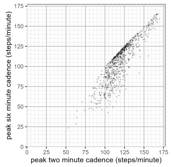Per-individual relationship between peak two-minute step accumulation and peak six-minute step accumulation (seven-day observation period).