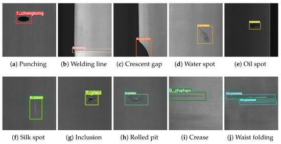 In this study, we utilize the open-source GC10-DET dataset [34], which is accessible on GitHub (Website online: https://github.com/lvxiaoming2019/GC10-DET-Metallic-Surface-Defect-Datasets (accessed on 24 February 2020)). GC10-DET is a dataset of steel strip surface defects collected in a real-world manufacturing environment, with a total of 2312 gray-level images. The dataset comprises ten types of defects, including Punching (Pu), Welding line (Wl), Crescent gap (Cg), Water spot (Ws), Oil spot (Os), Silk spot (Ss), Inclusion (In), Rolled pit (Rp), Crease (Cr), and Waist folding (Wf). In terms of data scale and defect diversity, the GC10-DET dataset demonstrates superior performance compared with other datasets focusing on steel strip defects. The size, shape, and location of defects within this dataset exhibit variability, and there are no fixed patterns for defects of the same type. Furthermore, the number and types of defects present in each image are not constrained. Therefore, this dataset is closer to the benchmark of the actual scene. Sample images from the GC10-DET dataset are illustrated in Figure 1.