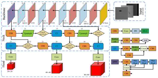 The structure of the CA-MbV2 module is shown in Figure 6. We proposed a highly efficient and lightweight network for feature extraction. Specifically, we replaced the first Conv structure in the backbone network with the R-Stem module, introduced the CA-MbV2 structure, and kept the SPPF module intact. The proposed network not only guarantees high detection accuracy, but also has a lightweight structure that satisfies real-time requirements for detecting surface defects on steel strips.