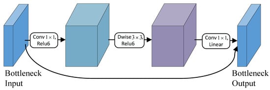 The backbone network of YOLOv5 contains four C3 structures, resulting in a large number of model parameters and slow detection. Therefore, it is crucial to develop a lightweight feature extraction network. MobileNetV2 [36] is a convolutional neural network architecture designed specifically for resource-constrained mobile or embedded devices. It optimizes memory usage and execution speed, while maintaining high accuracy with minimal computational costs and parameters. This architecture performs equally well in resource-limited settings, considerably reducing the number of required operations and memory demands. The fundamental module of MobileNetV2 is the bottleneck depthwise separable convolution with residual connections, as depicted in Figure 4. A compressed representation of low dimensionality is first input and subsequently expanded to a higher dimension, which is then filtered using a lightweight depthwise convolution. Finally, the acquired high-dimensional features are remapped to the low-dimensional space through a linear convolution.