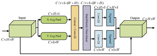 where and are the attention weights in the height and width directions of the feature map. The final output of the CA module can be expressed by Equation (6):