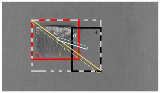 where represents the classification score, denotes the penalty term as shown in Figure 8, M signifies the highest scoring prediction box, represents other prediction boxes, and indicates the threshold value for NMS. Equation (8) defines , and denotes the Euclidean distance between the central points of M and . According to Equation (7), when the IoU value between the highest confidence prediction box and other prediction boxes is below the threshold value, the other prediction boxes remain unaltered; otherwise, the confidence of other prediction boxes decays until it falls below the threshold value, at which point the detection box is removed.
