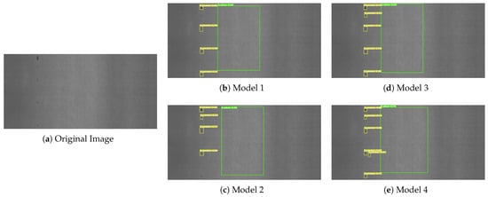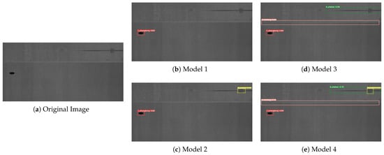 Detection results of inconspicuous defects. (a) Original image sample; (b) Model 1 detection results; (c) Model 2 detection results; (d) Model 3 detection results; (e) Model 4 detection results.