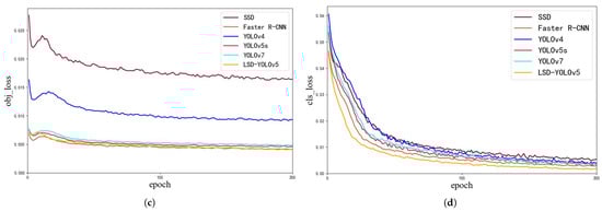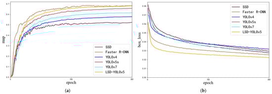 Figure 13 illustrates the comparison of evaluation indexes for different models. In Figure 13a, the mAP of our proposed model LSD-YOLOv5 was 67.9%, which was 2.4% higher than the original model. The convergence speed and stability of the model can provide a better assessment of the model’s performance. As shown in Figure 13, the loss curve had a larger drop at the beginning of the model training, indicating that the initial hyperparameter setting was reasonable. All other parameters held constant, the improved model had a steeper convergence curve in the first period. After a period of training, the loss curve gradually leveled off and the model converged. It can be seen that the improved YOLOv5s model has a more stable convergence state and higher convergence efficiency than the original model. Finally, as depicted in Figure 13b, the bounding box loss curve of the LSD-YOLOv5 model converged significantly faster than that of the original model, which can be attributed to the effectiveness of the CA attention mechanism in mitigating the effects of extraneous features and enhancing the extraction of relevant information.