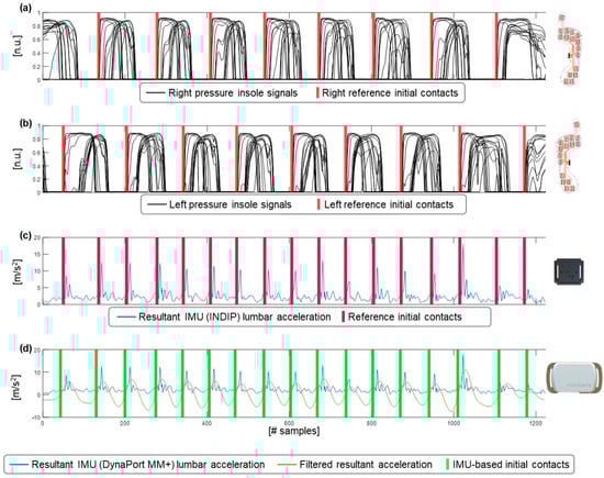 (a) Right reference initial contacts based on pressure signals (normalised units [n.u.]) of the right insole, (b) Left reference initial contacts based on pressure signals (normalised units [n.u.]) of the left insole, (c) Reference initial contacts based on the pressure insoles, as shown in (a,b), displayed on the resultant acceleration signal [m/s2] of the lumbar IMU of the INDIP system, (d) Resultant acceleration [m/s2], filtered resultant acceleration [m/s2], and the initial contacts based on the zero-crossings of the filtered signal.