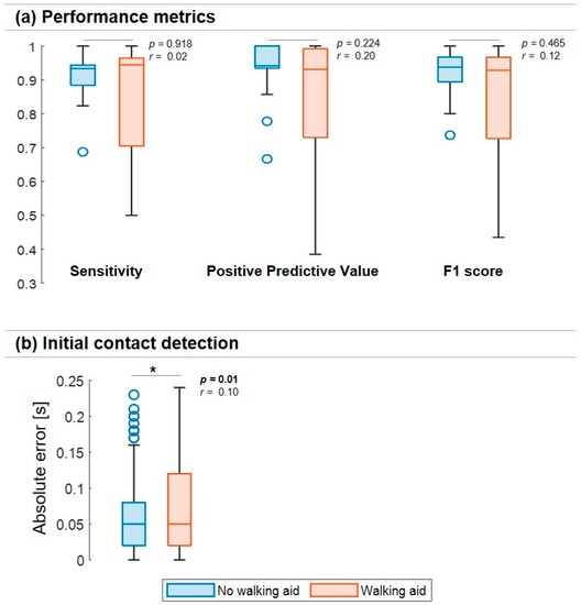 Comparison of patients with and without a walking aid for (a) different performance metrics (sensitivity, positive predictive value, and F1 score) and (b) absolute errors [s] in the initial contact detection. * shows a significant p-value. Boxplots (minimum, lower quartile, median, upper quartile, and maximum) are used to display values obtained from the different walking tests. Outliers are also shown.
