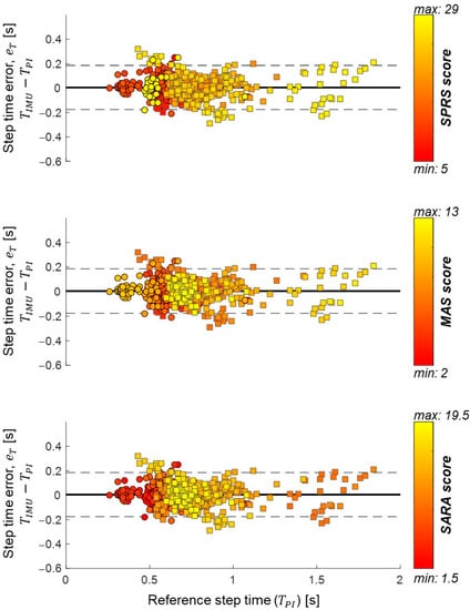 Bland–Altman plots for step time error values () calculated between IMU-based and reference step durations. Errors are assessed for each detected step (n = 596) and patients. Bias (continuous lines) and limit of agreements (dashed lines) are also shown. Values identified for steps performed by patients using walking aids are shown with squares; circles are used otherwise. The different colours indicate the disability severity based on the three clinical scales (colour-coded based on the relevant bar shown on the right): Spastic Paraplegia Rating Scale (SPRS), upper panel; Modified Ashworth Scale (MAS), middle panel; Scale for the Assessment and Rating of Ataxia (SARA), lower panel.