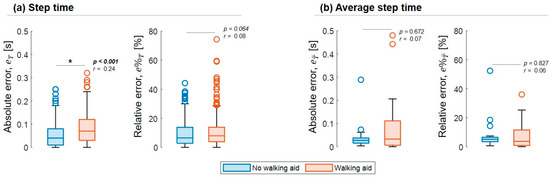 Boxplots (minimum, lower quartile, median, upper quartile, and maximum) of the absolute [s] and relative [%] errors for step time (a) and the average step time (b) duration distributions in patients with and without a walking aid are shown. Outliers are also shown. * shows a significant p-value.