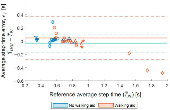 Bland–Altman plot for average step time () error between (single-sensor approach) and (reference pressure insole, reference): . Errors are assessed for each participant and walking test. Bias (continuous lines) and limit of agreement (dashed lines) are shown in blue for no walking aid and orange for walking aid users. The various symbols within the graph represent the different participants.