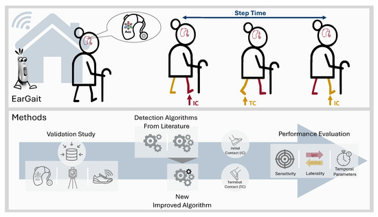 From an algorithmic perspective, a crucial aspect of such a gait analysis pipeline is the segmentation of recorded data into meaningful portions, such as individual strides. A stride is defined by the initial contact (IC) of one foot until the next IC of the same foot. Consequently, many gait analysis pipelines contain a gait event detection algorithm to detect initial and terminal contact (TC) events. In particular, most step and stride length algorithms directly rely on the detection of gait events [23,24,25], underscoring the significance of a reliable and accurate gait event detection algorithm as a fundamental component in comprehensive gait analysis pipelines. To our best knowledge, two algorithms have been described in the literature for gait event detection using ear-worn sensors [26,27]. Jarchi et al. [26] proposed an algorithm based on Singular Spectrum Analysis (SSA). They validated their method at different speeds with an instrumented treadmill. Diao et al. [27] proposed a similar algorithm and validated their method using multiple lower-body-worn IMUs. The algorithm was assessed for healthy young participants and postoperative patients. Both approaches are capable of estimating temporal gait parameters with high accuracy. However, the algorithms have not been validated against the gold standard for gait analysis, an optical motion capture (OMC) system. Moreover, the sensitivity and the distinction between ipsi- and contralateral steps have not been evaluated yet. The correct distinction between gait events from the left and the right foot is crucial for the computation of different stride-by-stride measures, including gait asymmetry [28], which is a promising marker for certain pathological gait conditions [29].