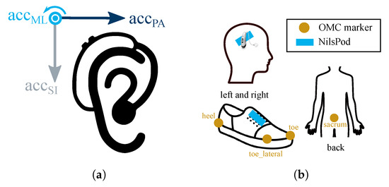 The sensor setup included (a) two hearing aids with integrated IMU and (b) optical motion capture (OMC) markers and NilsPod IMU sensors. The axes of the coordinate system are defined by the main anatomical axes, namely medial to lateral (accML), posterior to anterior (accPA), and superior to inferior (accSI).