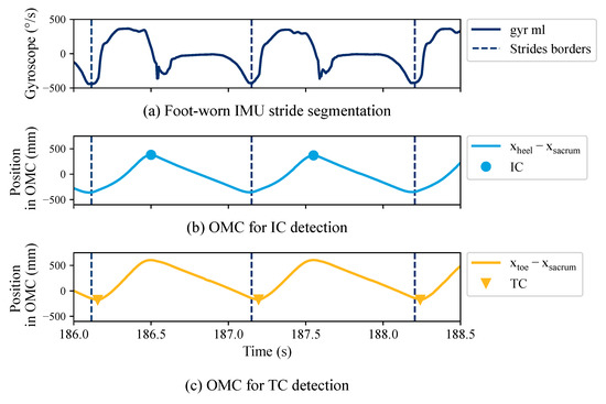 Reference gait events were estimated in two steps. (a) First, foot-worn IMU data were used to segment the region of interest, i.e., individual strides. Ref. [33] was applied to determine stride borders, followed by manual quality control. (b,c) Within each region of interest, gait events (initial contact–IC, terminal contact–TC) were estimated using the optical motion capture (OMC) system and the coordinate-based algorithm by Zeni et al. [36]. The example shows signals and gait events for the left side. The right side is not shown for visual clarity.