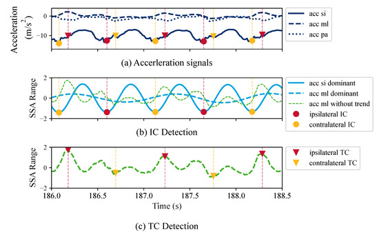 Two essential gait events need to be detected in order to segment individual strides and estimate temporal gait parameters: initial contact (IC) and terminal contact (TC). Ipsilateral (IL) and contralateral (CL) are used to distinguish between gait events of the same and opposite foot in relation to the sensor’s position. Both algorithms, Jarchi and Diao Original, apply an SSA to extract dominant oscillations associated with the repetitive gait pattern. An SSA is a model-free technique to decompose a signal into multiple orthogonal components, including slow varying trends, oscillations, and unstructured noise [38]. For ear-worn sensors, the slow trend is associated with head movements [26].