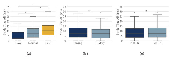 Absolute error (AE) of stride time for the Diao Improved algorithm for the different (a) walking speeds, (b) study groups, and (c) sample rates. The AE for walking speeds differs significantly (*; one-way ANOVA, ), but study groups and sample rates do not differ significantly (ns—not significant; ).