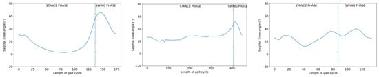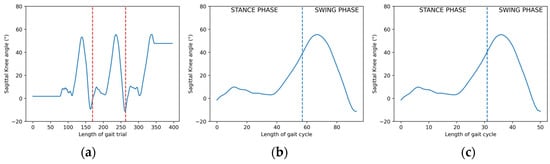 As mentioned in the Introduction, we focused on the analysis of the knee joint kinematics in the sagittal plane only (flexion/extension). Gait cycles were either used raw (see Figure 1b) or normalized into 51 points (i.e., 1 point for every 2% of the gait cycle), as shown in Figure 1c.