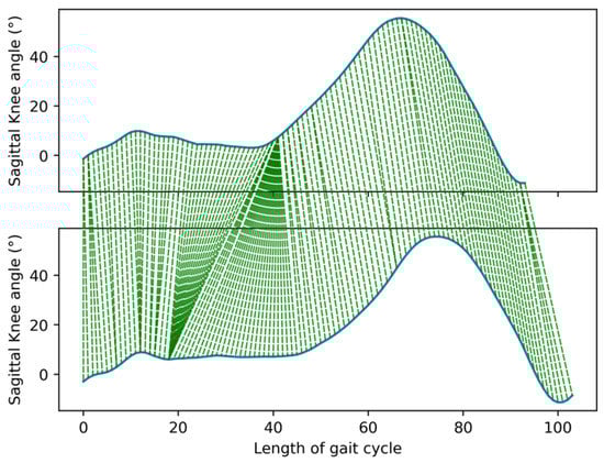 In our work, we faced a strong variability between individuals and even within the cycles of the same individual. To overcome the above-mentioned limitations of Euclidean distance, we integrated in the K-medoids algorithm an elastic distance, namely Dynamic Time Warping (DTW,) as a measure of the dissimilarity between two cycles []. DTW relies on finding the best warping path to assign two time signals, by minimizing the cumulative distance between the assigned points in the two signals. As illustrated in Figure 2, DTW accounts for time distortions between two signals (cycles) of different lengths.