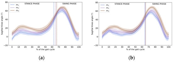 We first observed that the three medoids obtained with the Euclidean distance (see Figure 4a) showed a similar smooth shape, but differed in their amplitudes, especially during the loading response in the stance phase []. Also, we noted a lag in the transitions between the stance and swing phases for the three NGPs, ranging from 61.4% of the cycle for to 65.5% of the cycle for , as indicated in Table 3 (foot-off event). Additionally, the three cycles showed a progressive increase in the knee angle amplitude from to . With the DTW metric (see Figure 4b), the retrieved medoids showed more diversity during loading response and differed from those obtained with the Euclidean distance. Table 3 and Table 4 show the metadata associated with each NGP for both metrics. We did not observe a significant difference between the medoids in the two tables, but noted a difference between the three medoids in DTW in terms of speed and foot-off event.