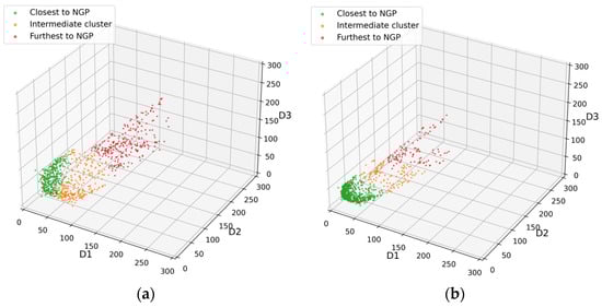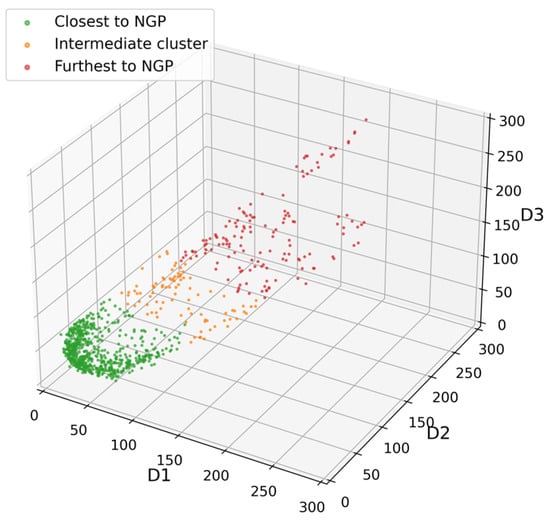 In the case of DTW distance, we observed a linear trend in the distribution of clusters in the 3D space: the orange cluster falls exactly between the green and red clusters. This was clearly not the case with the Euclidean distance. Additionally, the green cluster shows less variance within the DTW metric (see Figure 5b compared to Figure 5a).