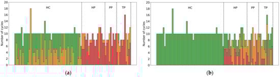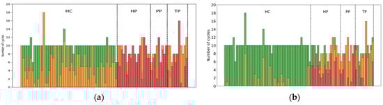 Distribution of cycles for each person (a bar represents one person) within the three clusters with (a) Euclidean distance and (b) DTW distance. Cycles in green are the closest to NGPs, followed by cycles in orange and then in red (the most distant to NGPs). Persons are grouped according to their class: HCs for healthy controls, HP for Hemiplegic, PP for Paraplegic and TP for Tetraplegic patients.