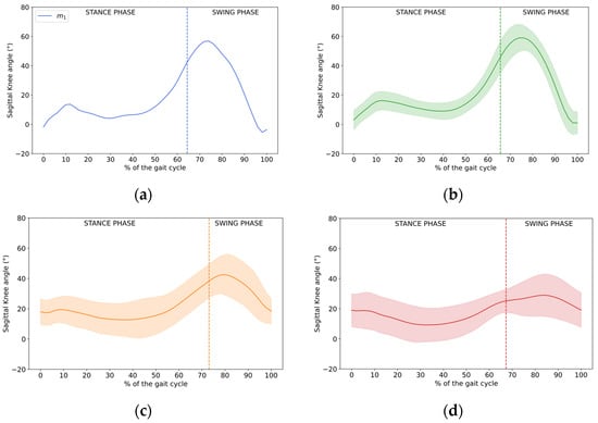 Examples of: (a) one NGP (, (b) average curve of all cycles belonging to the green cluster, (c) average curve of all cycles belonging to the orange cluster and (d) average curve of all cycles belonging to the red cluster. The standard deviation is also reported along with the average. For the NGP in (a) and the average curve of each cluster in (b–d), each reported in one color, Stance and Swing phases are split thanks to a dotted line in the corresponding color.