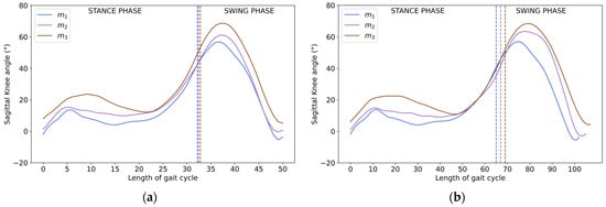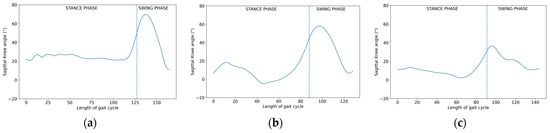 With DTW, the three NGPs seemed to capture the diversity that naturally exists in the healthy population: we noted, particularly in the stance phase, that the retrieved NGPs were irregular and showed time shifts between one another. Additionally, we noted, as can be seen in Figure 4b, that the transitions between the stance and swing phases of the three NGPs appeared between 63.1% and 64.3% of the cycle, as indicated by the foot-off event in Table 4. This reflects the potential of DTW for time-aligning two signals at important transitions comparatively to Euclidean distance.