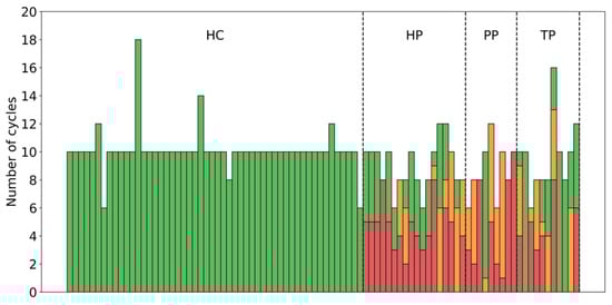 We enrich our analysis by displaying, in Figure 7, the distribution of cycles per person in clusters. Each person was described by a vertical bar, accounting for the number of cycles of this person in each cluster, maintaining the same color code (green, orange and red). For better readability of the graph, healthy controls (HCs) are grouped on the left and patients are grouped by motor impairment on the right, sorted as follows: Hemiplegia (HP), Paraplegia (PP) and Tetraplegia (TP).