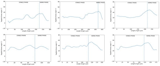Finally, 36 orange cycles became red when considering their raw description. Some examples are displayed in Figure 15. Again, we noticed the significant quality degradation in such gait cycles.