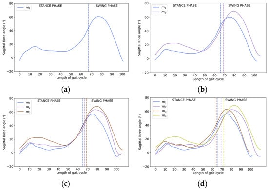 The retrieved NGPs considering (a) one reference (K = 1), (b) two references (K = 2), (c) three references (K = 3) and (d) four references (K = 4) to represent the variability of normal gait. For each NGP, reported in one color, Stance and Swing phases are split thanks to a dotted line in the corresponding color.