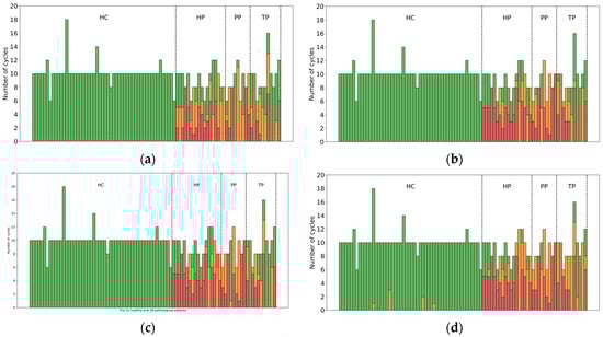Figure 12 presents the cycles that are assigned to the three clusters relative to their labels. Compared to Figure 7b (for normalized cycles), the difference concerns only patients, since all healthy cycles remained assigned to the green cluster, as expected. For HP patients, in most cases, the cycles assigned to the red cluster corresponded to the impacted side. For such patients, we clearly observe in Figure 12 that some of their cycles were assigned to the green cluster, accounting for the non-impacted side, while the other cycles were assigned to the most distant cluster to the NGP (red).