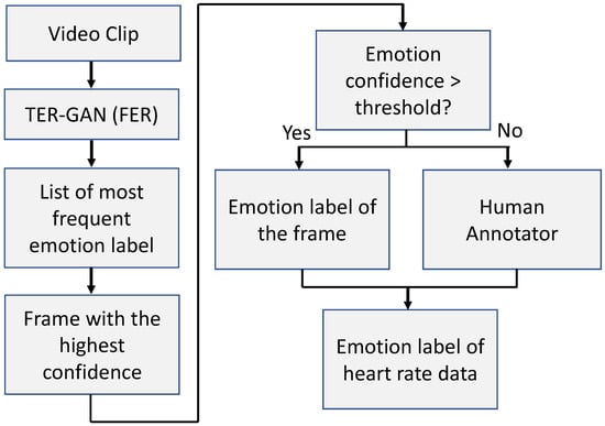 The heart rate data are aligned with the videos of the children working with the avatar to complete the given task. To label the heart rate data, a semi-automated emotion classification algorithm based on facial expression recognition is developed. Figure 3 shows the flow diagram of the semi-automated emotion annotation process. During this annotation process, the off-the-shelf TER-GAN [20] FER model is leveraged, using added parameters to classify two more emotions, i.e., neutral and contempt, and fine-tuned on the in-the-wild AffectNet dataset [44]. Each video is divided into clips containing video frames, where is the multiplication of the frame rate of the video and the time segment corresponding to the window size. The frame rate of the videos in the dataset is 25 fps. For the window size of two seconds, the value of n is . Then, the video clip is inputted to the FER model frame by frame to obtain a representative frame for the entire video clip, and the length of the video clip is synchronized with the transmission frequency of the heart rate sensor of the smartwatch. The representative frame is chosen based on two criteria: (1) the label of the representative frame should be the most frequent label, and (2) the prediction confidence of the frame should be the highest in the frequency list. After automatically obtaining the representative frame and its emotion label, the algorithm decides whether or not to employ a human annotator based on the confidence of the model predicting the emotion label. If the confidence value is lower than a threshold, then the human annotator steps in, and after analyzing the full context of the situation, the final label of the representative frame is assigned. Since the heart rate is aligned with the video data, the emotion label of the video is assigned to the corresponding heart rate data. In this paper, emotions are categorized into three classes: neutral, positive, and negative. Therefore, the heart rate data are clustered into these three groups.