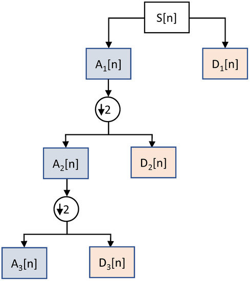 DWT filters decompose a signal into two bands at any particular level, i.e., approximations and detail bands of a signal. The approximations (A) correspond to the low-frequency components of the signal at a high resolution. The details (D) are high-frequency components of the signal at a lower resolution. During the sub-sampling process, the components of a signal are divided by 2 for multi-resolution analysis, as shown in Figure 4. The pre-processed heart rate data are inputted to the DWT decompositions. This multi-scale DWT decomposition is also called sub-band coding. The sub-sampling at every scale decomposes a signal into half the number of samples. Figure 5 shows the multiscale decomposition of a signal into sub-bands at various levels. In this paper, DWT features are extracted for emotion recognition by decomposing the heart rate signal using the Haar wavelets. The segments extracted from the signal using a window size of 2 s are fed to the DWT to extract the features. The Python PyWavelets [47] library is used to implement the DWT-based feature extraction algorithm.
