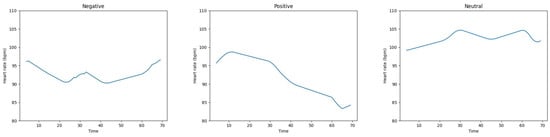After extracting DWT features from the heart rate signal, three different classifiers are used to recognize emotions. SVM, KNN, and random forest (RF) [48] classifiers are used for intra-subject and inter-subject classification. Intra-subject emotion classification is performed when the heart rate data from the subject are acquired individually, and then the classifier is trained and tested on the same data, whereas in inter-subject emotion recognition, the heart rate data are collected from all participants rather than individually, and are used for the training and testing of the recognition modal. All of the experiments were performed using a ten-fold cross-validation method. For comparison purposes, similar to [16], experiments are also conducted using the heart rate data as the input feature to the classifiers. Figure 6 shows the heart rate signals of three different participants in the negative, positive, and neutral states.
