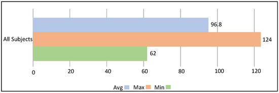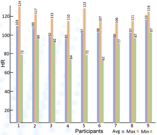 Summary statistics of the heart rate data acquired during the interactions of children with the avatar are shown in Figure 7. Figure 7 shows the average heart rate, the minimum heart rate, and the maximum heart rate of all participants. As can be seen during the completion of tasks and the interaction with the avatar, the participants go through a range of heart rate activities. Figure 8 shows the maximum, minimum, and average beats per minute of all nine participants. The average heart rate of all nine participants is 96.8 BPM, while the maximum heart rate is 124 BPM (Participant 6) and the minimum heart rate is 62 BPM (Participant 1).