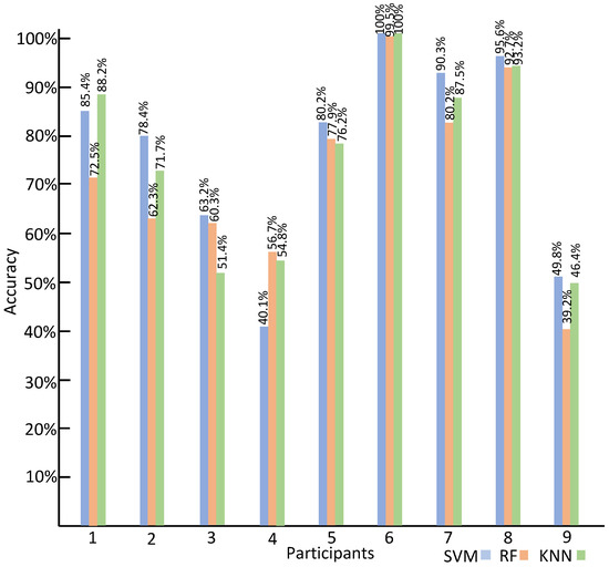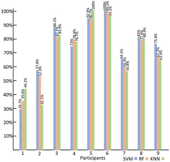 Similarly, the intra-subject classification accuracy of the three classifiers using HR data is shown in Figure 10. In the case of SVM, the highest accuracy of 100% is obtained from Participant 6, and the lowest recognition accuracy of 29.7% is obtained from Participant 1. In the case of KNN, Participant 5 obtains the highest accuracy of 100%, and Participant 2’s emotion recognition accuracy of 32.1% is the lowest. For RF, the highest accuracy of 99.2% is obtained from Participant 6, and the lowest accuracy of 35.6% is obtained from Participant 1.