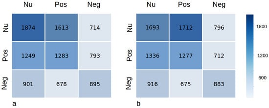 (a). The confusion matrix of the experiment performed with DWT features. (b). The confusion matrix of the experiment performed with the raw heart rate signal. ‘Neg’ stands for the negative class, ‘Pos’ represents the positive class, and ‘Nu’ stands for the neutral class.